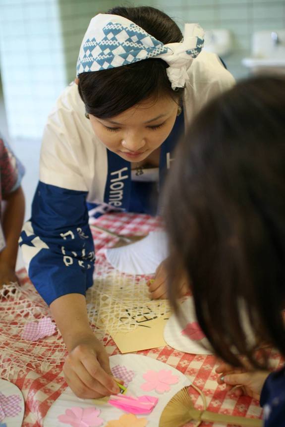 ここでは日本の夏に欠かせない「日本文化」である団扇をデコレーションする団扇ワークと、今回のイベントの中心である阿波踊りのレクチャーを行いました!!