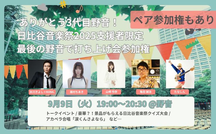 【ペア参加権】日比谷音楽祭2025支援者限定 最後の野音で打ち上げ会参加権