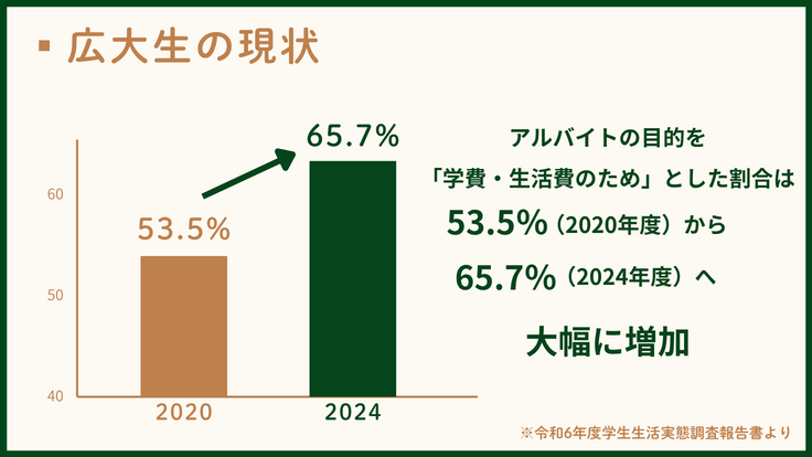 本学が行った令和6年度学生生活実態調査報告書によると、時給単価の上昇などにより総収入は増加傾向にあるものの、アルバイトの目的を「学費・生活費のため」とした割合(65.7%)が2020年度調査(53.5%)と比較して大幅に増加しており、収入の増加分がそのまま学費や生活費などに充てられている現状がうかがえます。