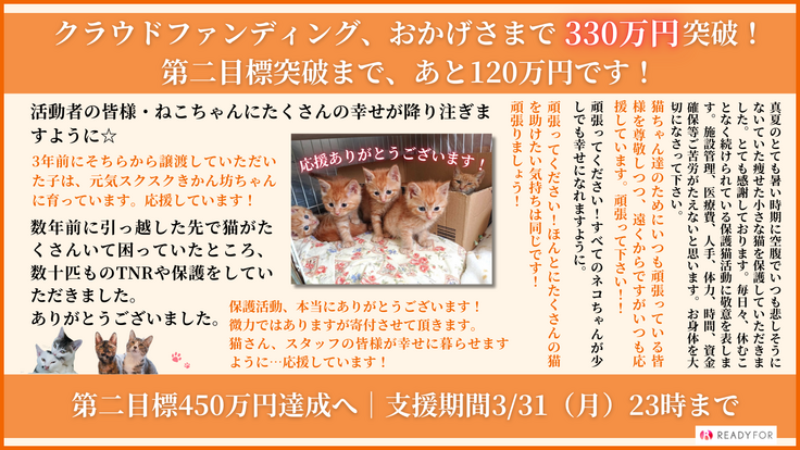 現在、ネクストステージ450万円達成にむけて走っており、早速330万円を突破しております!ありがとうございます!