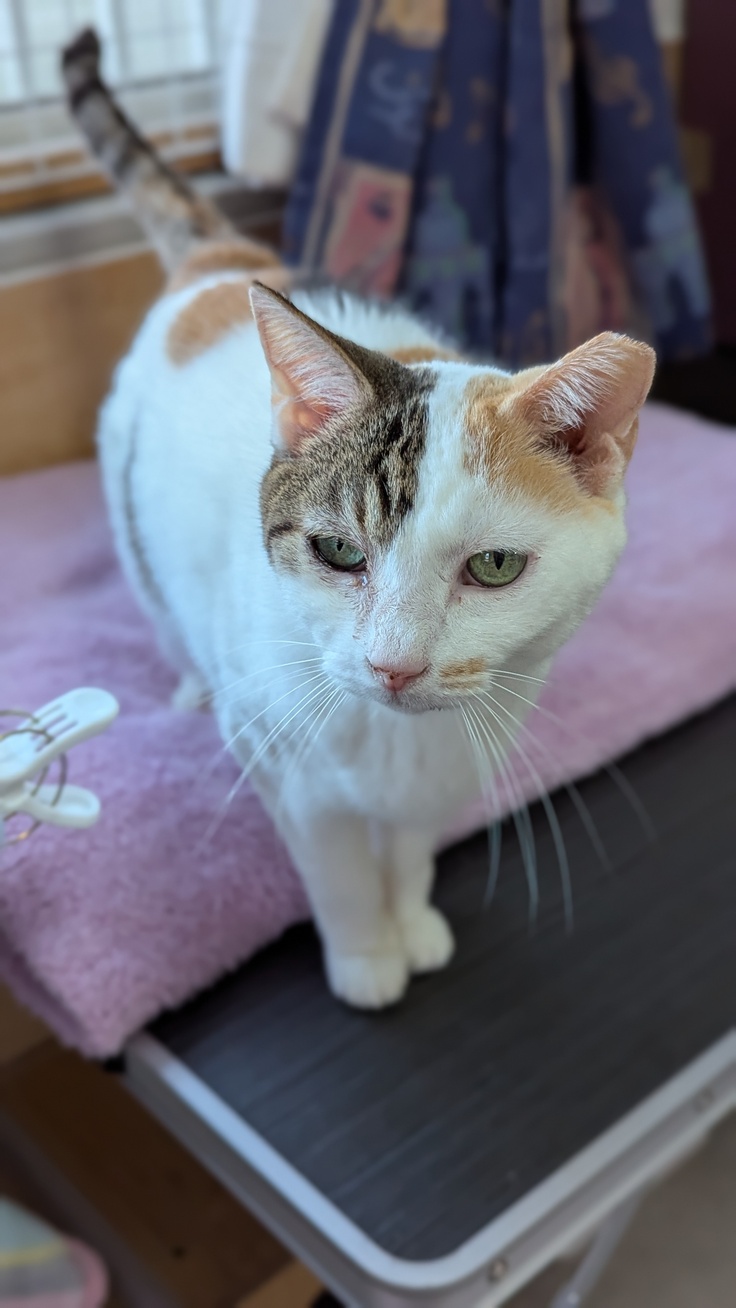 小さい頃に猫風邪をひき目に白内障が残ってしまいました。とても甘えん坊で可愛い性格なので、優しい里親さんの元へ送り出してあげたいと思っています。