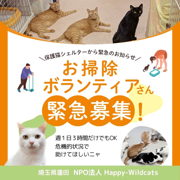 シェルターでは保護猫ちゃん達のお世話とお掃除をしてくれるボランティアさんを募集中です!
