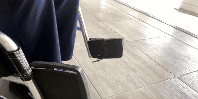 A:介助する場合のフットサポートの開閉操作では、介助者は車椅子ユーザーの脚を持ち上げ、『スマートフットレスト』に乗せ、内側に傾けることで開操作を行います(下動画)。閉操作は車椅子ユーザーの脚を降ろし、介助者が『スマートフットレスト』底部を足で軽く跳ね上げることで、あとは自動的に閉じます。