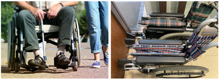 ご紹介する『スマートフットレスト(ウイルス接触低減型フットサポート)』は、車いすフットサポートの新たな発明品です。フットサポート(英語圏ではフットレスト)とは、車いすの足置き部分のことを指します。足を乗せるときは開いた状態で使用しますが、跳ね上げる(閉じる)ことができ、乗降時に邪魔にならないようにしたり、折りたたみの際にコンパクトにすることができます。