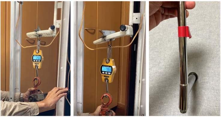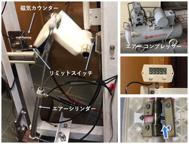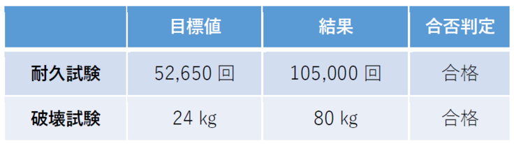 A:耐久試験では52,560回を目標数に設定(一日20回の開閉操作×6年(車いすの耐用年数)×1.2(安全率20%))しましたが、不具合など生じることなく10万回の繰り返し耐久試験をクリアしました(最終的には105,000回でスプリングの破損にて終了:写真右下)。