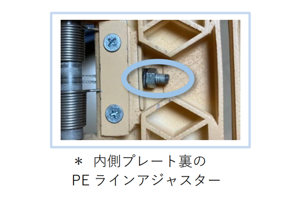 A:PEラインが短い状態が考えられます。内側プレート裏面のPEラインアジャスター(調整器)ネジで、PEラインの長さを長く調整してください。