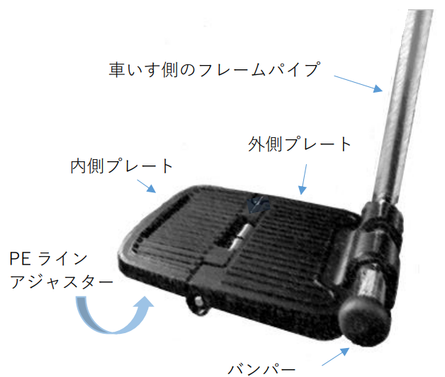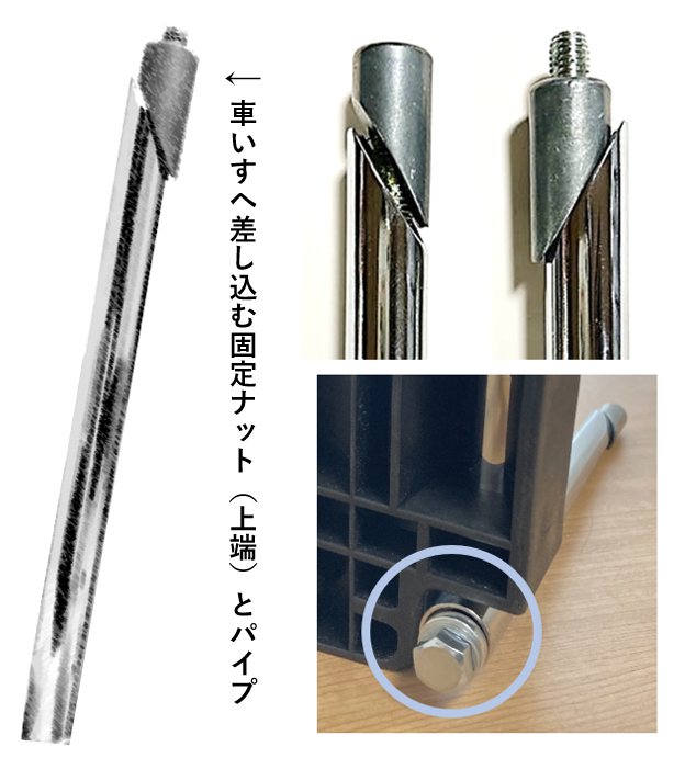 取り付け方法:差し込み式のフットサポートはプレート裏側のパイプ先端にボルトがあります(写真右下)。これを緩めるとボルトと反対側の固定ナットが緩んでフットサポートが取り外せます。『スマートフットレスト』の固定ナットを緩めた状態で車いすのフレームパイプに差し込み、ボルトをしっかりと締めて固定します。