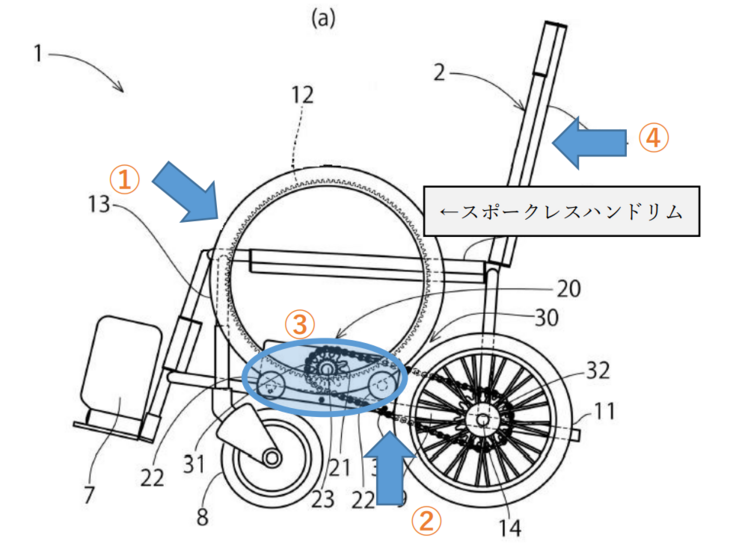 感染予防の観点からタイヤと分離したスポークレスハンドリムを用いた車いすの構想図