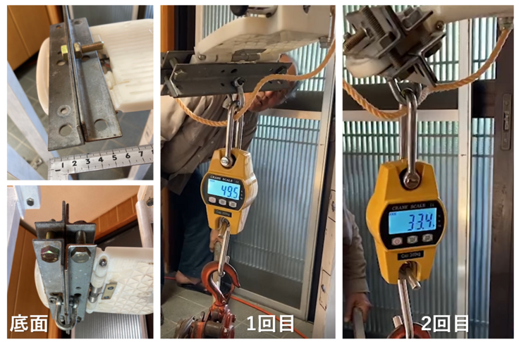 また、破壊試験では、プレート中央部への静止荷重約80kgで取り付けパイプが曲がりましたが、プレート部分の損傷はありませんでした。
