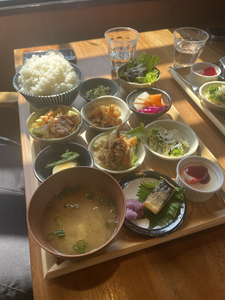 一つ一つ手作りのおかず10品と珠洲産のコシヒカリ、汲んできた湧水で出汁を取り作ったお味噌汁が付いています。