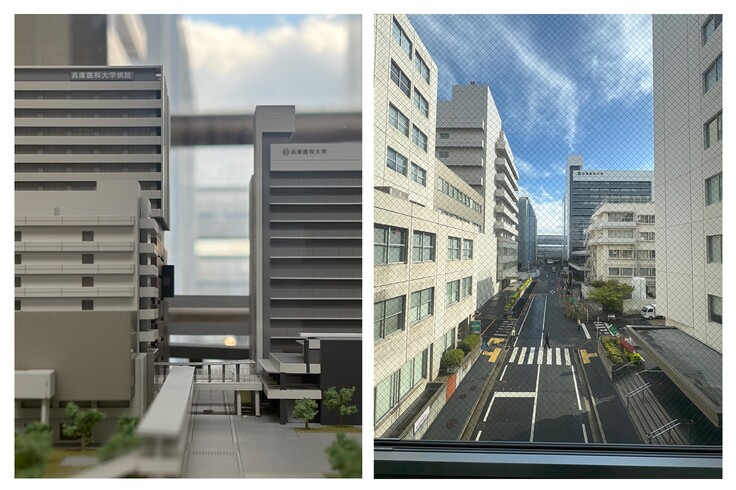 本日は、模型(左)とブースがある渡り廊下から見た建設中の新病院(右)