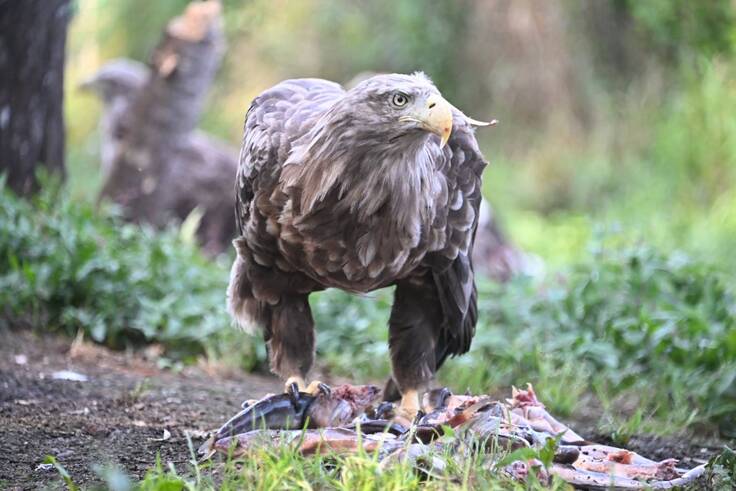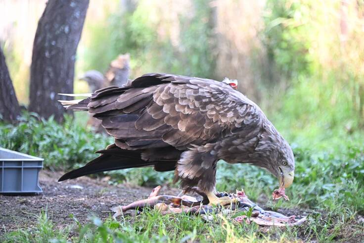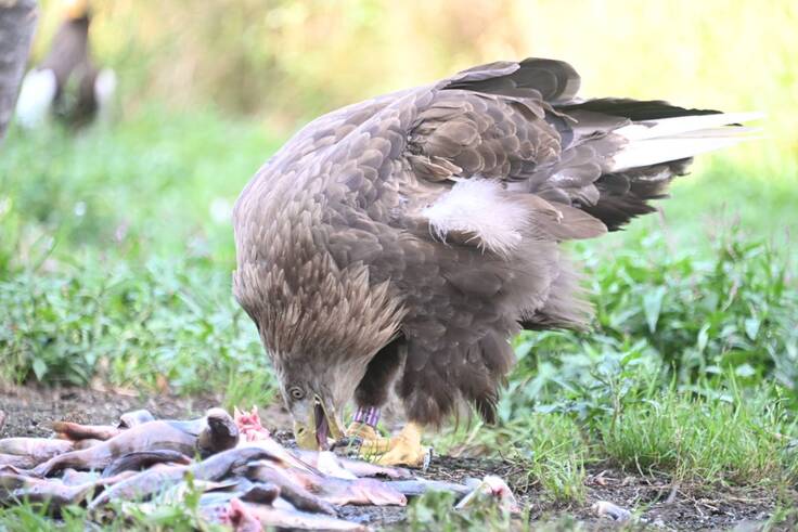 終生飼育しているワシたちの食事風景。山盛りのホッケを強い一羽が独占しないように、数カ所に分けて与えています。
