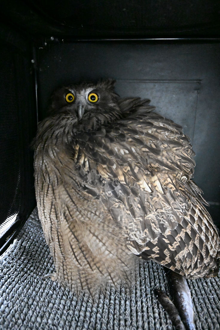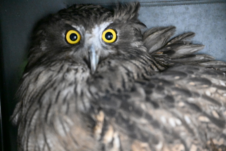 交通事故に遭いリハビリ中のシマフクロウ。以前放送されたNHKダーウィンが来た!で「なつ」と紹介された個体。