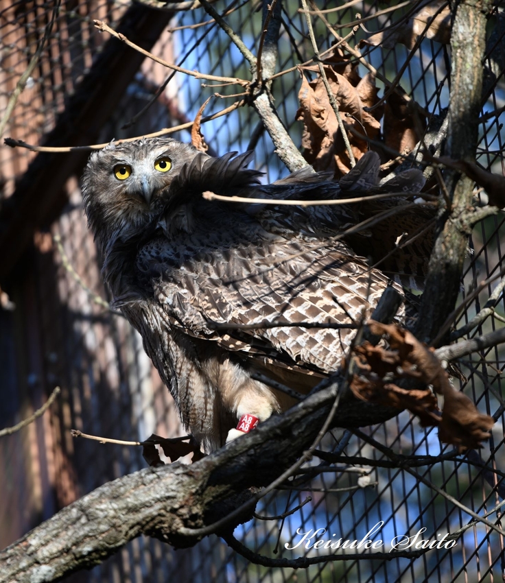 交通事故に遭ったものの、治療によって回復したシマフクロウ。今、大型フライングケージの中でリハビリに励んでいます。眼光も鋭く、本来の迫力を取り戻しつつあります。