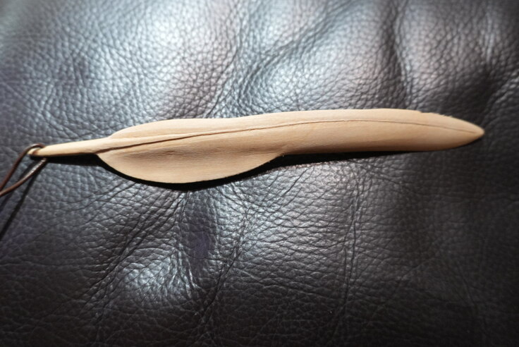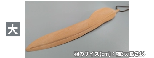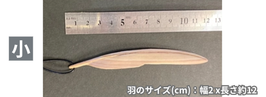木彫りで表現されるハイタカの風切羽根。両方のエッジをナイフとして使えるように加工しているため、利き手問わずご使用いただけます。小・大サイズよりお選びいただけます。また、よりリアルなバーニング処理を施した作品もありますので比較してお選びください。
