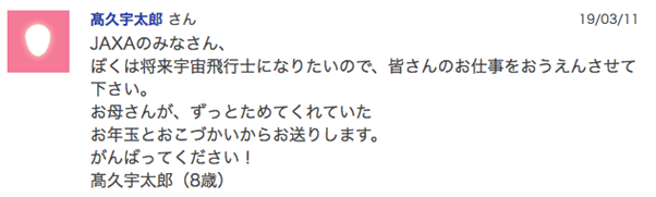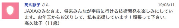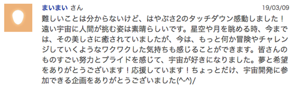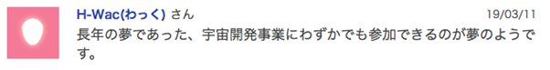 〜宇宙は夢の場所であると同時に、人類の挑戦の場でもあると考えております。地道な研究開発を積み重ね、引き続き皆様とともに宇宙に挑戦し続けていきたいと思いますので応援の程よろしくお願い致します!~