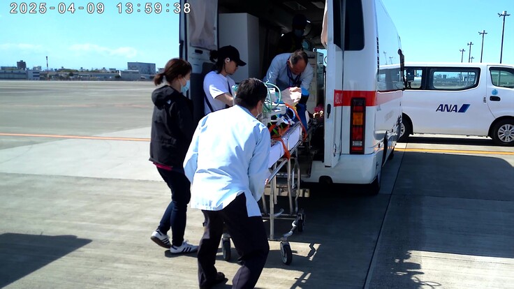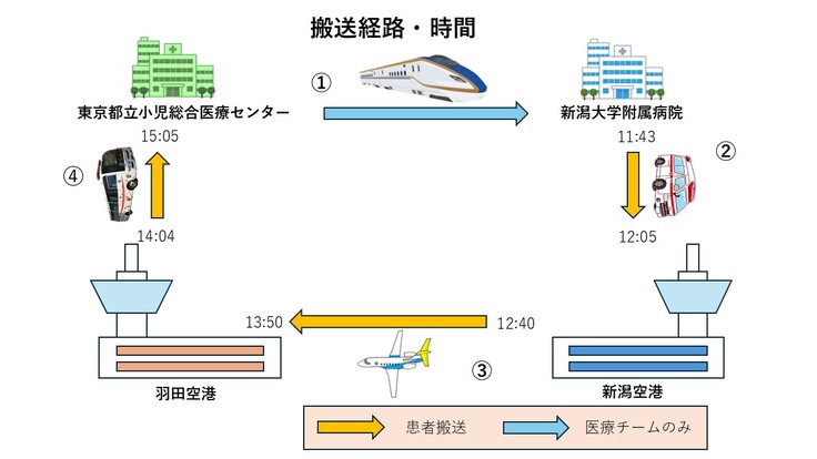 搬送チームが新幹線で新潟大学病院に赴き、新潟空港まで搬送し、機内に搬入しました。