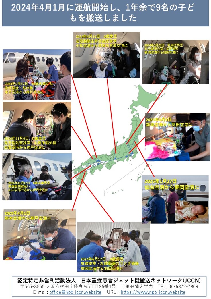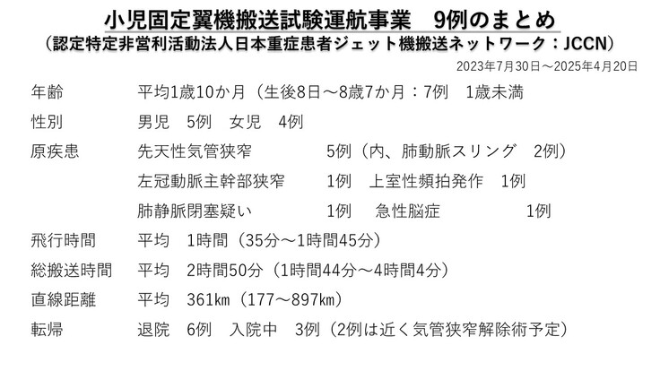 下図に9例のまとめを示しますが、患児の年齢は平均1歳10か月(1歳未満7例)で、原疾患は先天性気管狭窄5例、心疾患3例でした。飛行時間は平均1時間、総搬送時間は平均2時間50分で、施設間の直線距離は平均361㎞でした。患児は現在全例生存中で、6例は退院、3例は入院中(内2例は予定手術の待機中)でした。