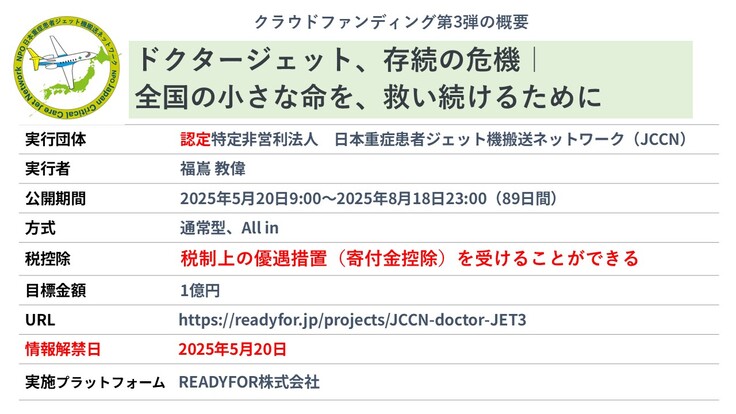 そのため、ドクタージェットのを運営するには、温かい皆様のご支援に頼らなければならない現状です。