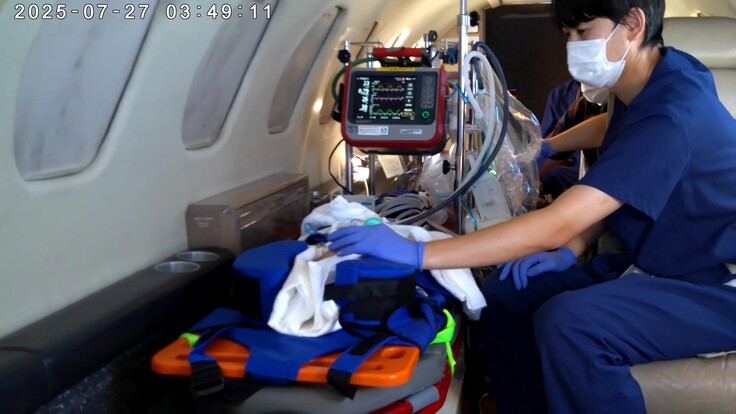 写真は機内の様子ですが、男児には肺に空気を送るための気管チューブが挿入されていて、そのチューブが抜けないように管理することがたいへんでした。