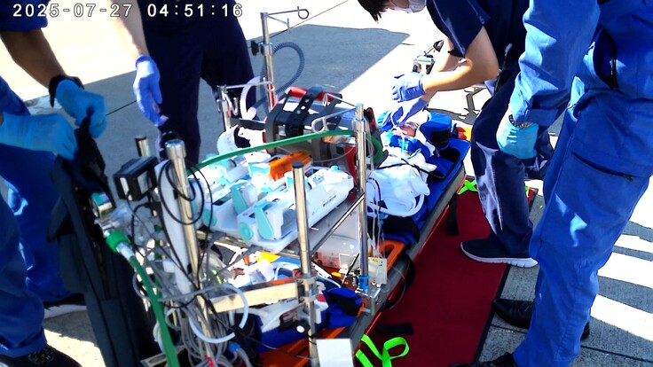 搬送した男児は、出生すぐに呼吸不全となり、人工呼吸器が装着されました。生後3日目に搬送元病院に転院し、肺動脈スリングと先天性気管狭窄とされ、生後5日目に肺動脈スリングの手術を受けました。その後も呼吸困難があり、人工呼吸器を外せないので、7月25日に兵庫県立こども病院に搬送することになりました。