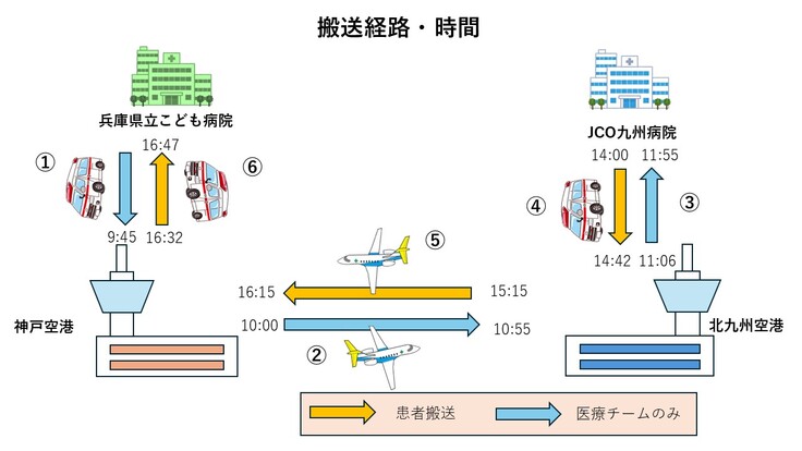 搬送チームは、10時00分に神戸空港でを離陸し、10時55分に北九州空港に到着し、JCHO九州病院に赴きました。患者の状態把握と家族への説明を行い、患者を搬送しやすい状態にバックボードに固定しました。14時00分にJCHO九州病院を出発して、14時42分に北九州空港まで搬送し、機内に搬入しました。
