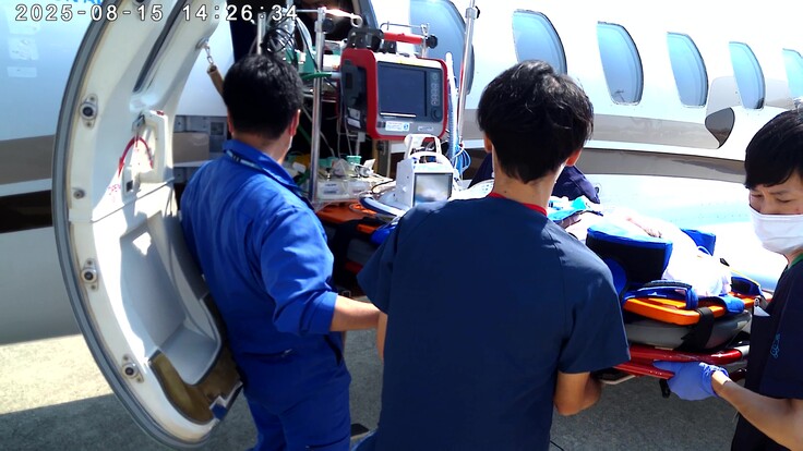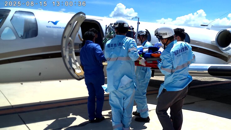 搬送チームは、8時50分に神戸空港でを離陸し、9時50分に福岡空港に到着し、福岡の病院に赴きました。患者の状態把握と家族への説明を行い、患者を搬送しやすい状態にバックボードに固定しました。12時40分に福岡の病院を出発して、12時57分に福岡空港まで福岡市消防局の緊急自動車でに搬送し、機内に搬入しました。