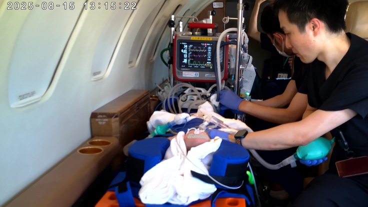 右肺が無形性で左気管支狭窄の程度が強く、右先天性横隔膜ヘルニアも併発して人工呼吸器を必要とする女児でした。写真は女児を機内に搬入していシーンです。