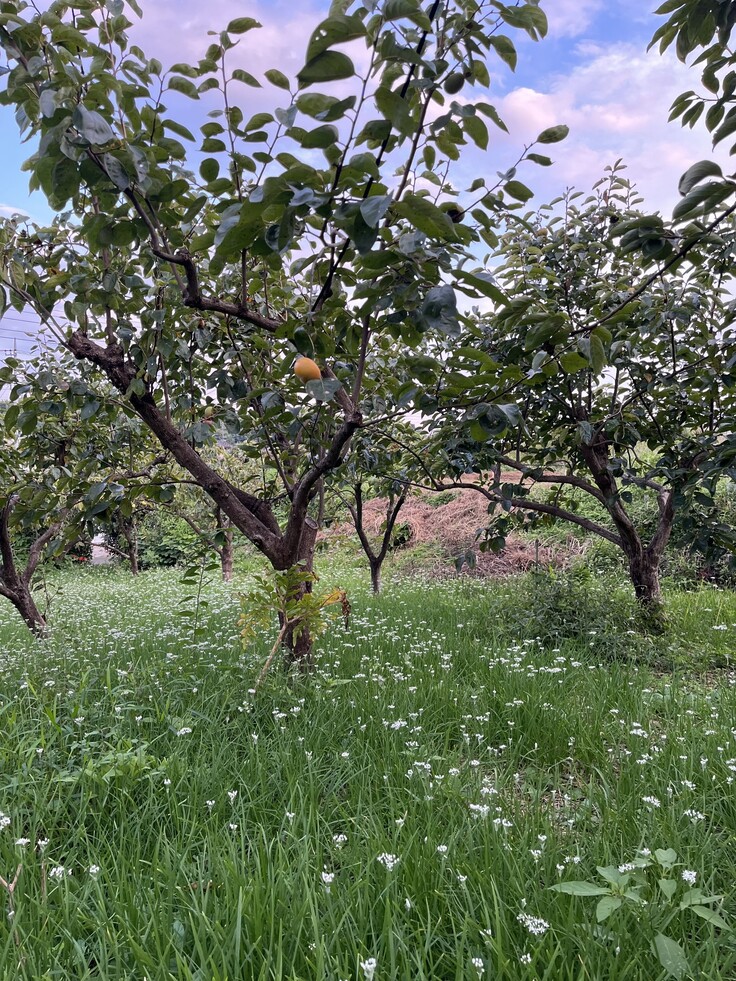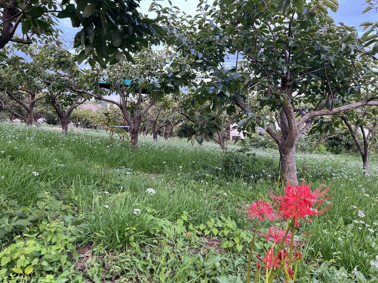 ちょうど柿畑では、ミロコさんが描いてくださった“にらの花”が満開になりました。
