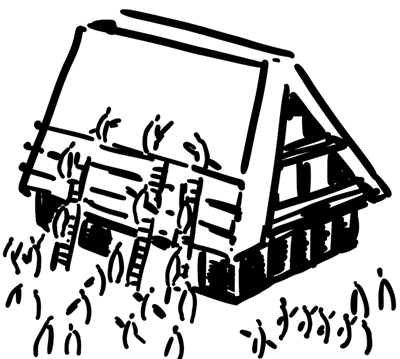豪雪地帯である白川村では、ドアや窓が雪で埋まらないように、家の周りに雪囲いをします。