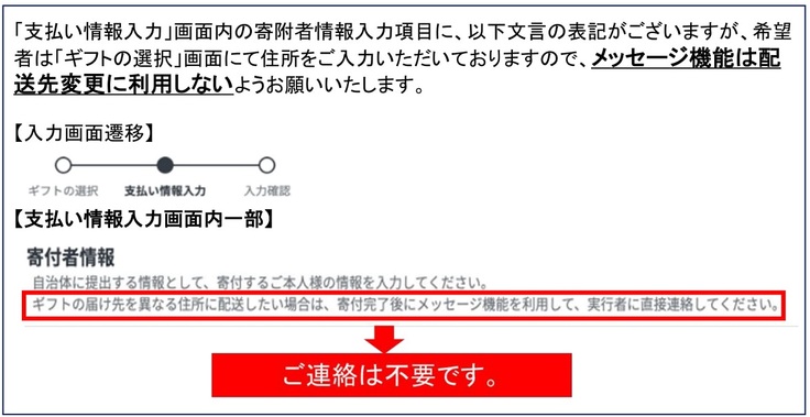 ●返礼品によっては、ご登録いただく寄附者情報とは別の住所に送付が可能となっております。別の住所に送付の場合は、必ず「ギフトの選択」画面入力時にあります質問項目に従って、ご入力ください。