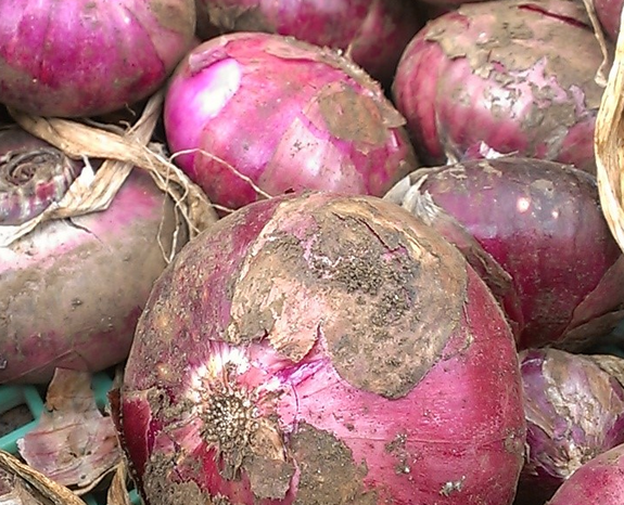 (種類も豊富な”かわさきそだち”、この紫玉ねぎも噛むほど甘く子どもにも人気です。)