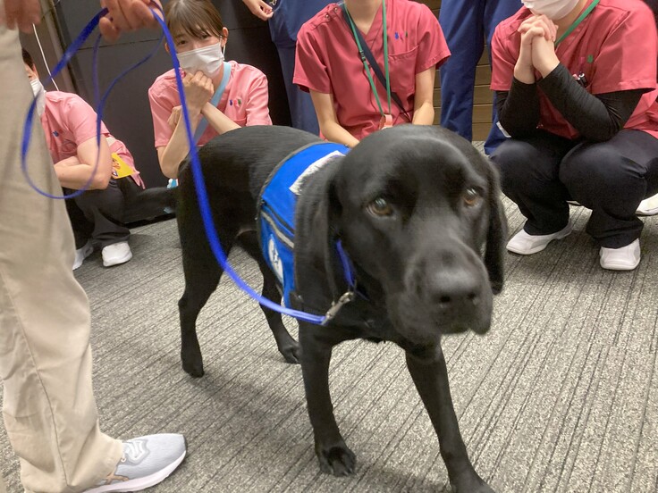 神奈川県⽴こども医療センターで活躍中のファシリティドッグとハンドラーさんが来院してくれました。ファシリティドッグの役割やハンドラーとの連携、実際の活動についての説明をしていただきました。