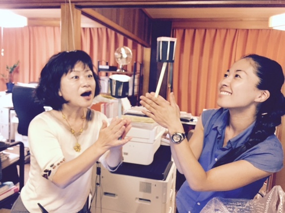 写真は、事務局で試作品を試して、童心に戻っている名護事務局長とスタッフの新垣さん。
