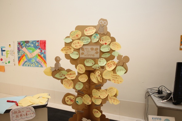 また、当日は、ダンボールアーティストの町の郵便局員さんが作ってくれたKIFFOの木もかざられ、映画の意見が貼り付けられました。