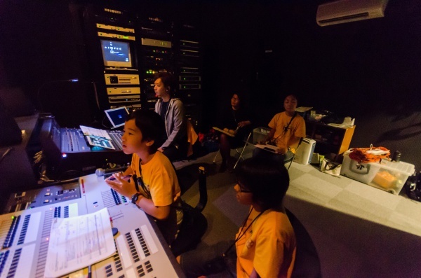 照明・技術スタッフははじめて使うインカムに緊張しながら、舞台や場内誘導係りと連絡を取り合い、ライトの調整をしていました。