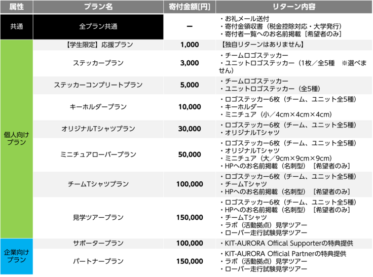 リターンについては、KIT-AURORA公式サイト(https://kit-aurora.jp/crowdfunding/)にて詳細を掲載しております。