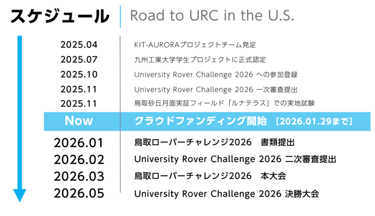 University Rover Challenge 2026は2026年5月27日~30日、アメリカ合衆国ユタ州・The Desert Research Station(MDRs)での開催が決定しています。プロジェクト成立後、天災等やむを得ない事情(緊急事態宣言などコロナウイルスによる影響を含む)により、イベントが開催できなかった場合や大会運営側の審査の結果等により大会出場を果たせなかった場合も、ローバー開発を同スケジュールにて実施し、資金を使用いたします。