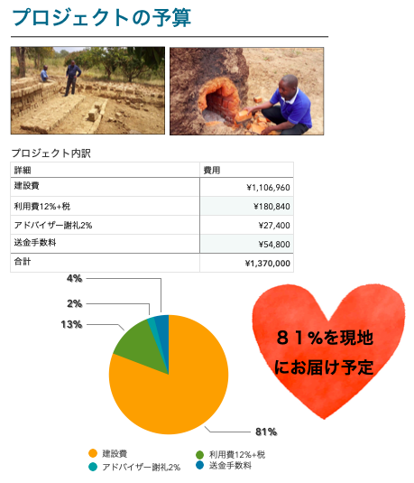 本プロジェクトはAll-or-Nothing形式です。期日までに目標金額に届かなければ、支援金は100%支援者様に返金となります。目標137万円を達成した場合は、手数料など差し引き約110万円を現地に送金する試算です。