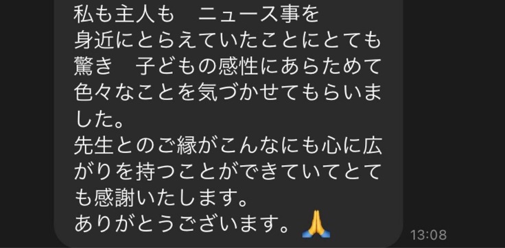 世界のニュースを身近に感じて言動された息子さんの愛に、私も感動しました。
