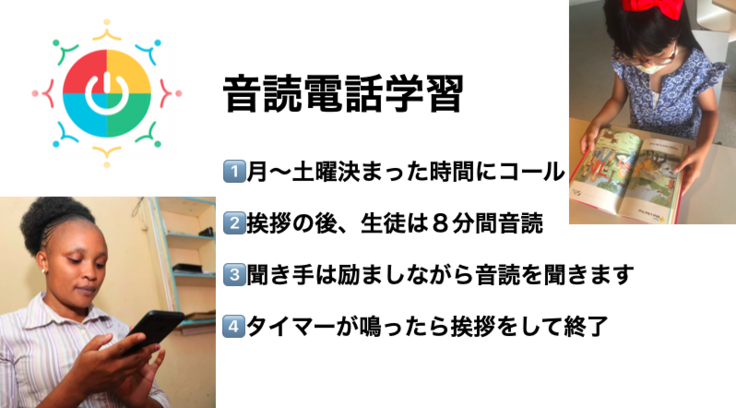 私たちの英語学習はちょっと特殊です。毎日決まった時間に、ケニアから電話がかかってきて、生徒さんは毎日8分間テキストを音読します。