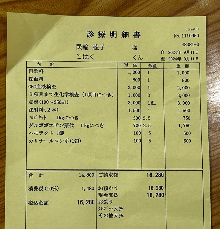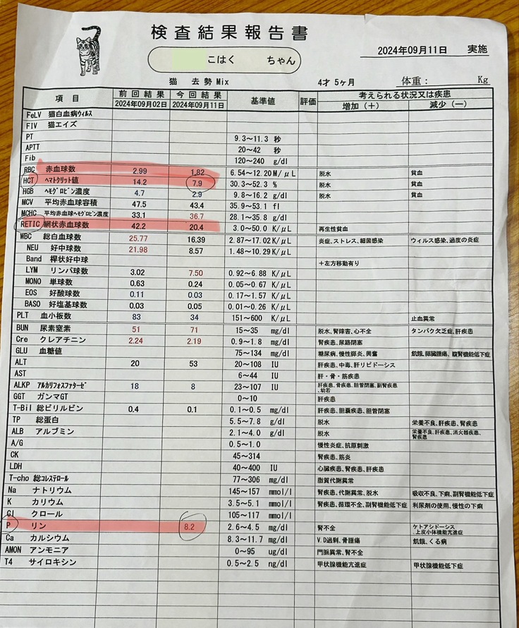 貧血が悪化していてリンの数値が高くなっていました。リンはリン吸収剤のお薬を出してもらい、貧血には増血剤の注射と鉄分サプリを出してもらいました。