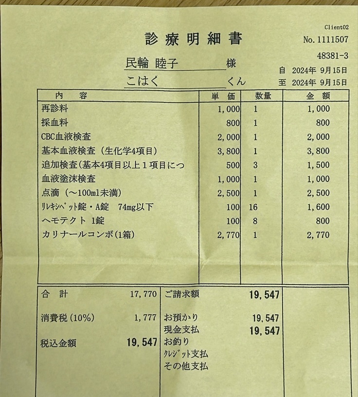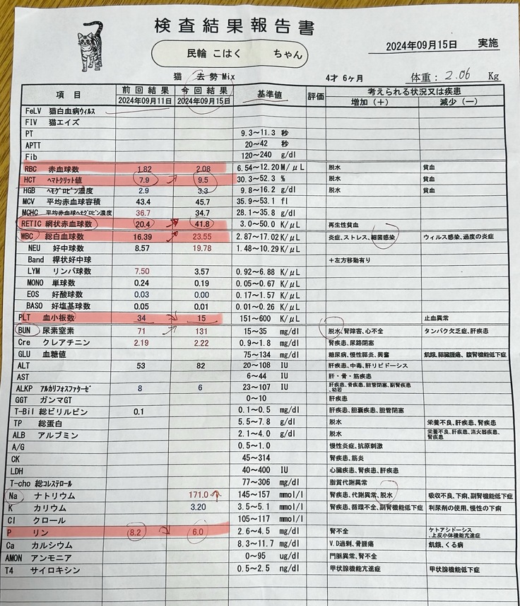 熱があったので、もしかしたら骨髄の機能が破壊されてるかもと言うことで、血液検査の結果が悪ければ翌日輸血の準備ということでしたが、結果は貧血の数値はまだかなり悪いものの数値が上がってきているので、今回は輸血なしとなりました。