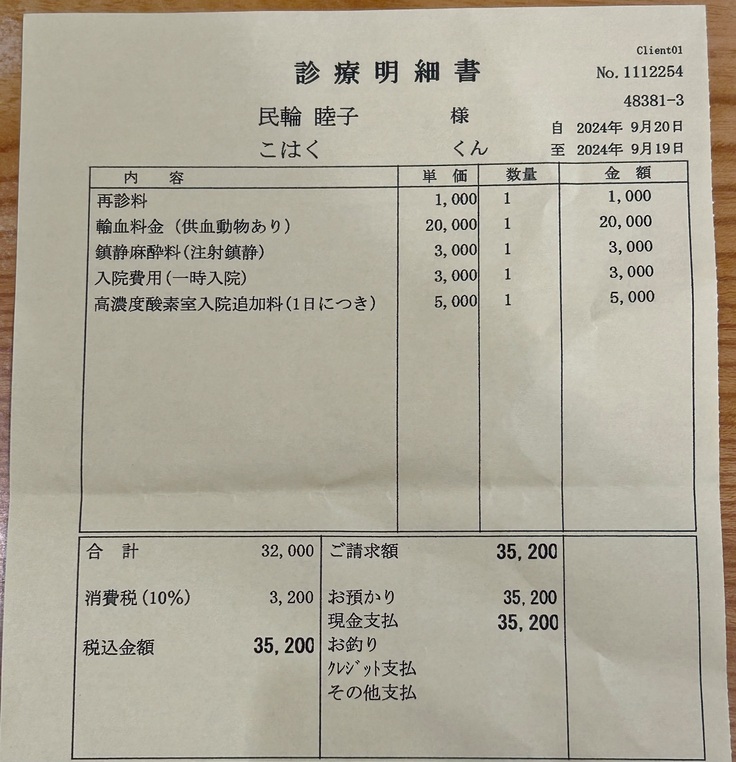 輸血しなければ時間の問題と言われていた私達には選択肢がなく、そして琥珀の生命力を信じて輸血をお願いしました。