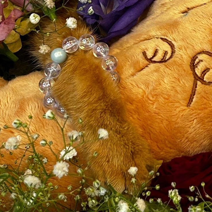 3枚目の写真に、「琥珀が道に迷わないように」とつけさせてもらったお数珠と琥珀の手が写っています。