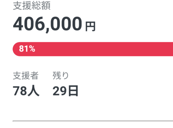 お陰様で募集期間折り返し時点で達成率81%という想像以上のペースで進行しておりまして、家族一同ほんとうに驚きつつ、今回の件は多くの方の優しさを知れた貴重な人生経験となっております。