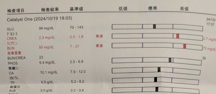 懸念は相も変わらず腎臓で、キャバリアの基準値でクレアチニン正常値は1.8なのが2.3、BUNは基準27なのが55となっています。