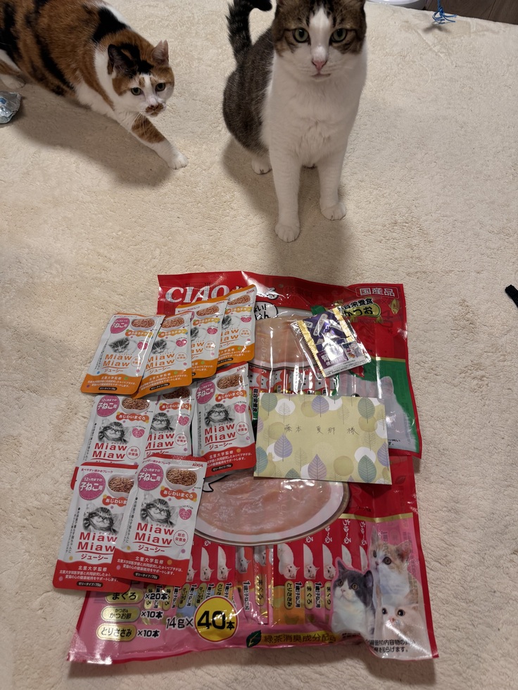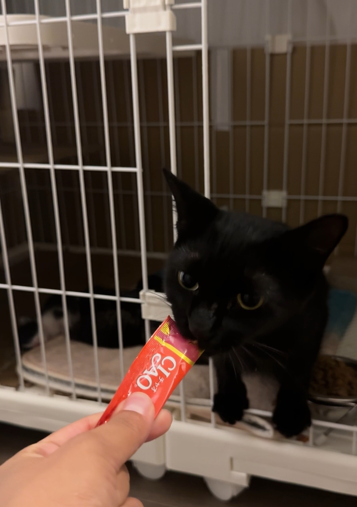 「これは黒猫ちゃんと、子猫ちゃんのだよ〜」といいつつ、ちゅーるをあげちゃいました♪
