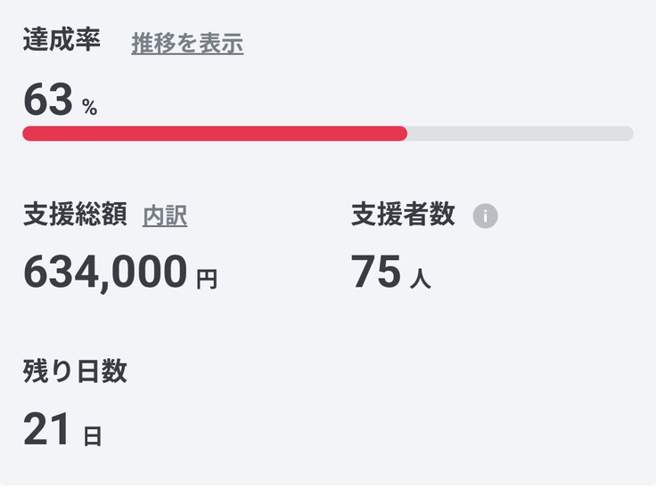 みなさまの温かい応援のお陰で、残り21日63%まできました。
