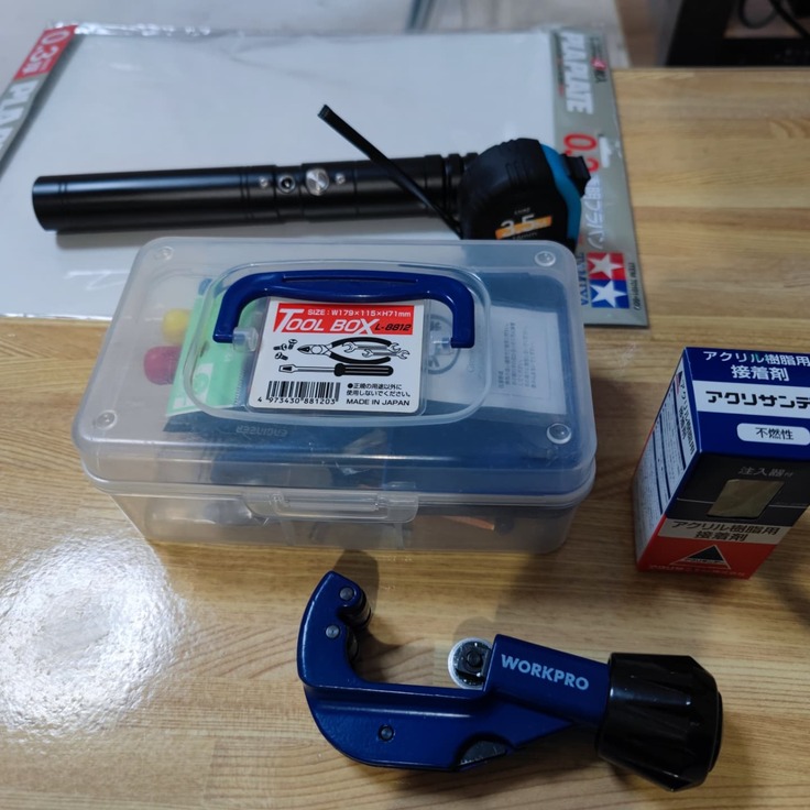 金属加工やポリカーボネートの加工など、特殊な工程を多く含みます。そのため、一部の作業は専門機械のあるホームセンターなどで行います。